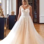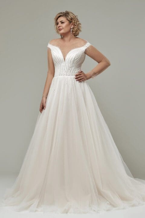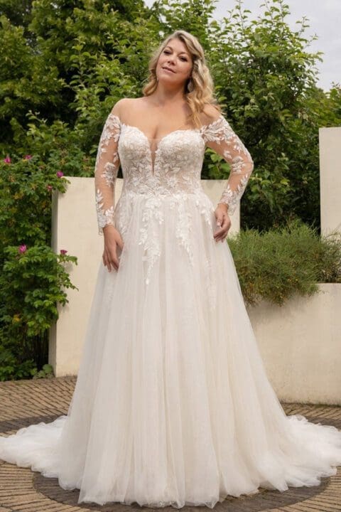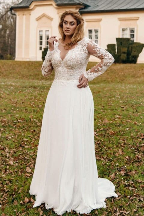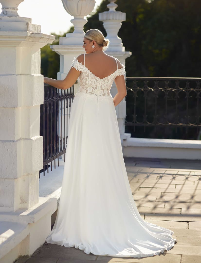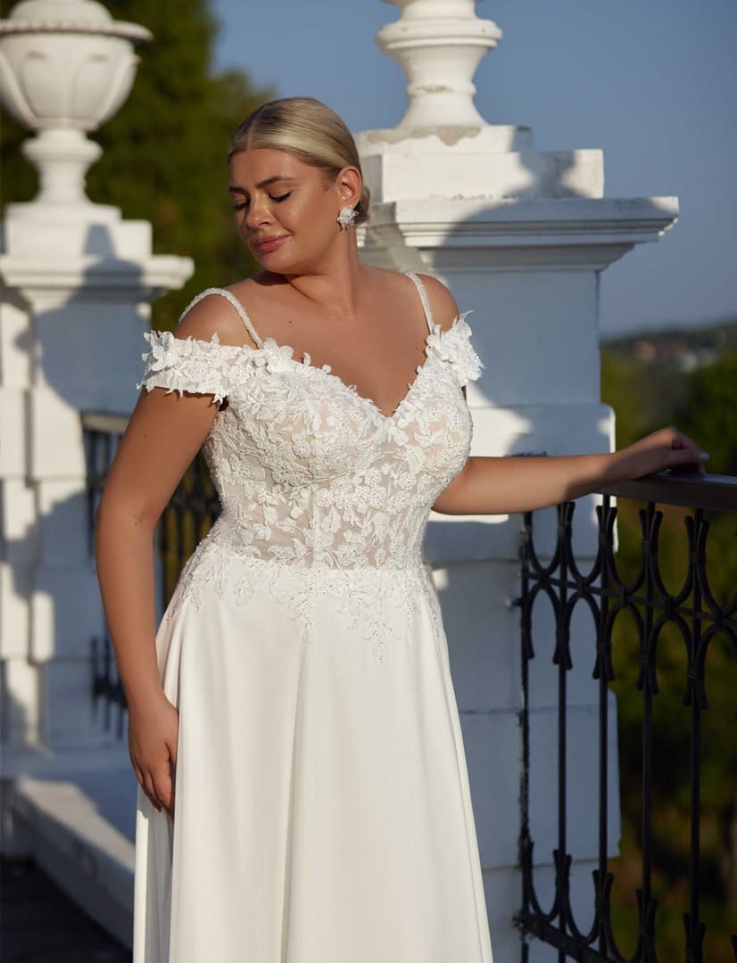 Elegantes Brautkleid für grosse Grössen mit einem Chiffonrock und einer Schleppe. Das Oberteil ist mit einer romantischen Spitzenapplikation ausgestattet. Die Carmenträger geben einen Hauch von Romantik. Zusätzlich hat das Oberteil Spaghettiträger, welche für einen guten Halt sorgen.