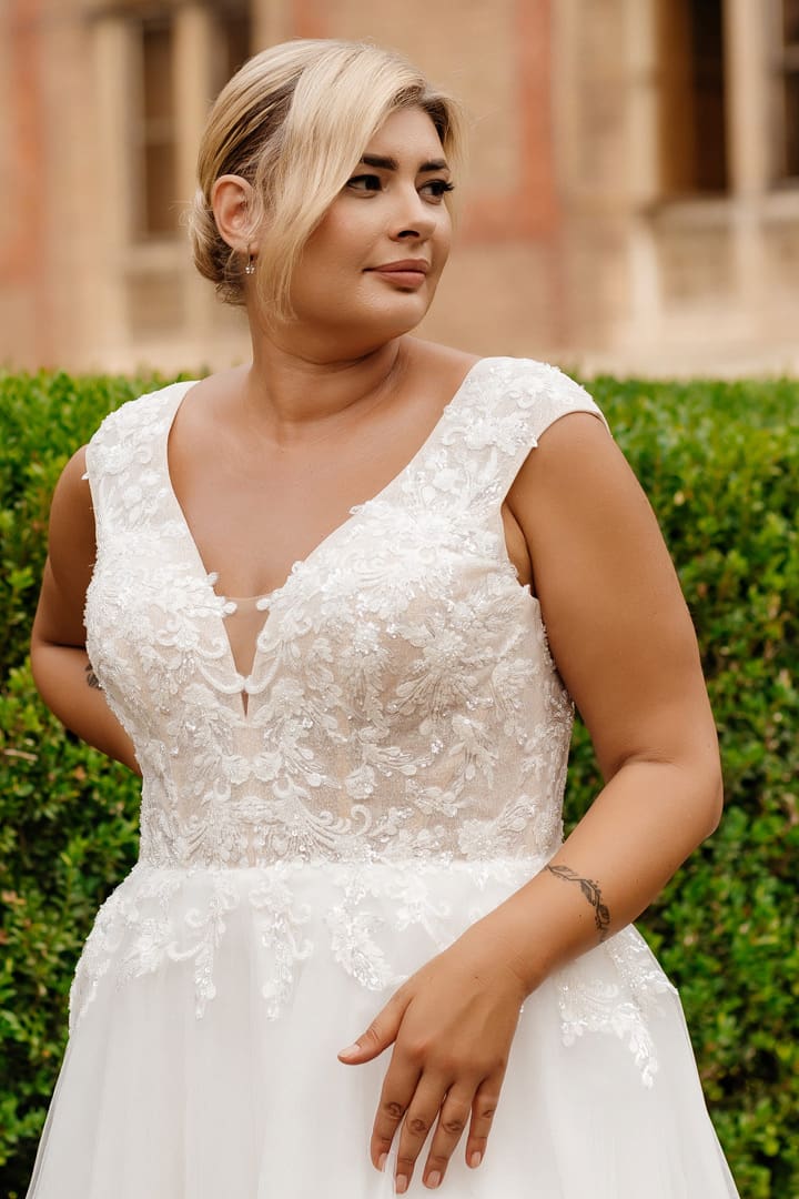 Wunderschönes Plus Size Brautkleid mit einer zarten Spitzenapplikation. Das Oberteil hat breite Träger und sorgt für einen guten Halt. Der Rücken hat einen V-Ausschnitt. Der weite Tüllrock mit der langen Schleppe ist ein Hingucker der besonderen Art.