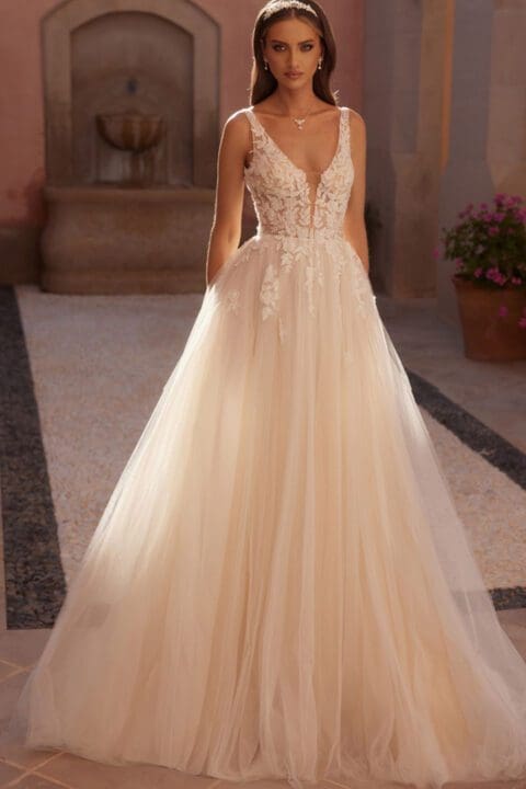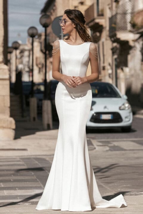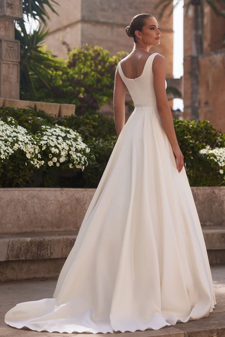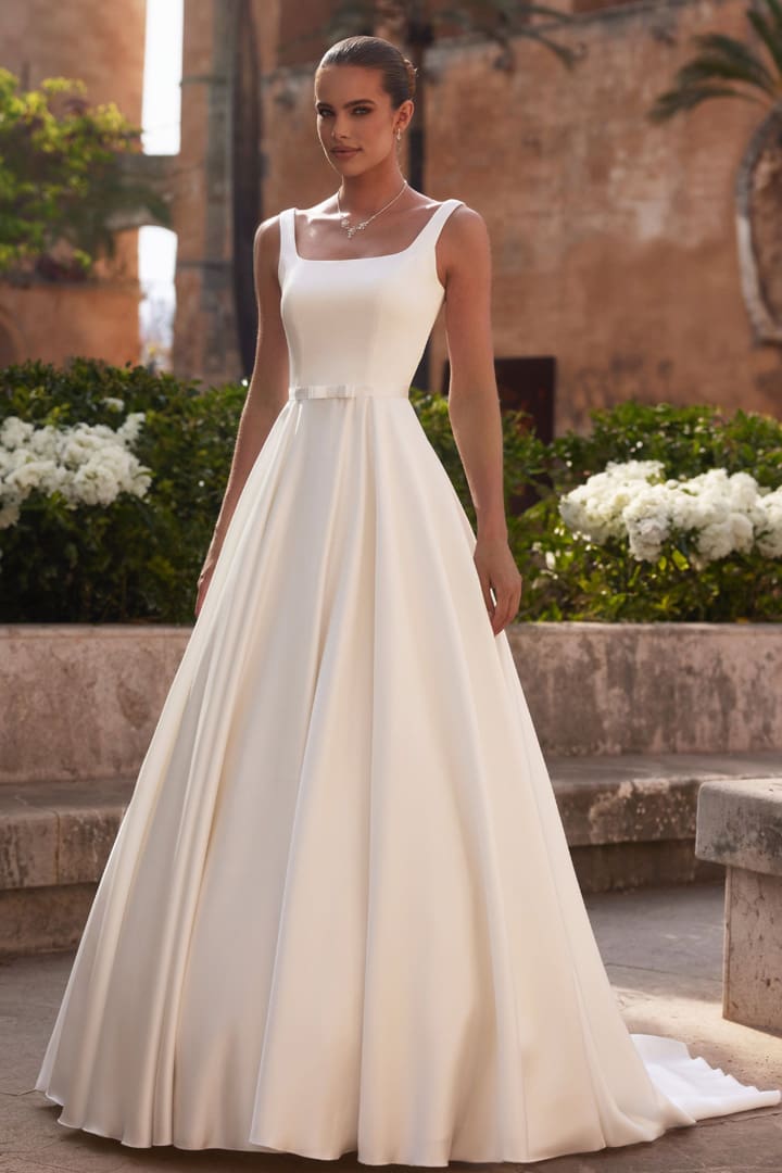 Das Brautkleid Levente ist ein elegantes A-Linie Brautkleid aus hochwertigem Mikado-Stoff. Dieses Kleid besticht durch eine Schleppe und einem raffinierten quadratischen Ausschnitt vorne und hinten. Ergänzt wird das Design mit einem Gürtel mit Schleife. Optimal auch möglich mit einem Glitzer Gürtel.