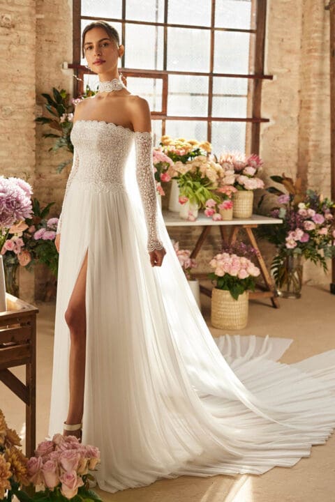 Das schlichte Brautkleid Venetta bietet puristische Eleganz für einen unvergesslichen Hochzeitstag. Elegantes Design hochgeschlossen mit zarten Flügelärmelchen (auch ohne Ärmel erhältlich). Das elegante Brautkleid hat eine kleine Schleppe. Falls gewünscht, ist das Brautkleid auch mit einem Beinschlitz erhältlich.