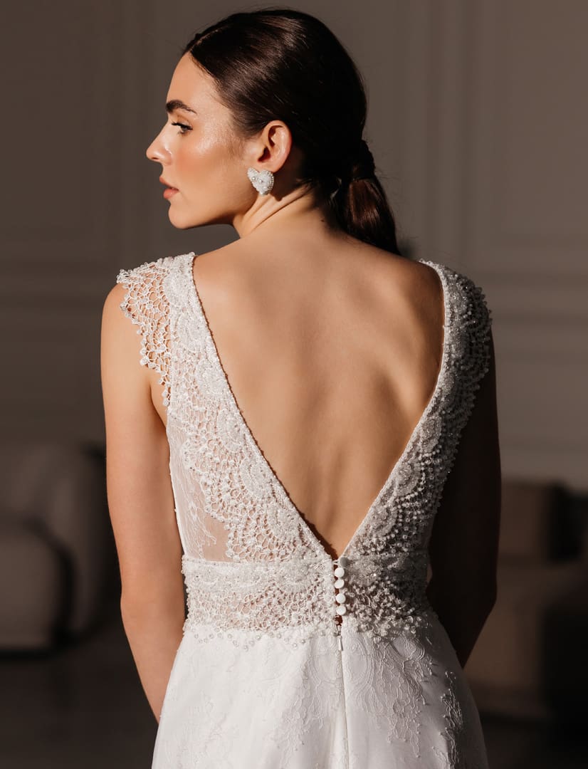 Elegantes Fit 'n' Flare Brautkleid mit einer romantischen Vintage-Spitze. Das Oberteil hat breite Träger und ist mit unzähligen Perlen und Strasssteinen verziert. Der Rücken hat einen tiefen V-Ausschnitt.