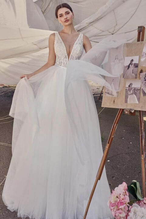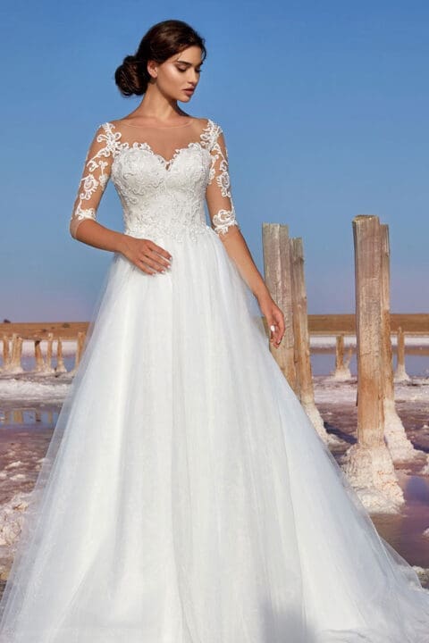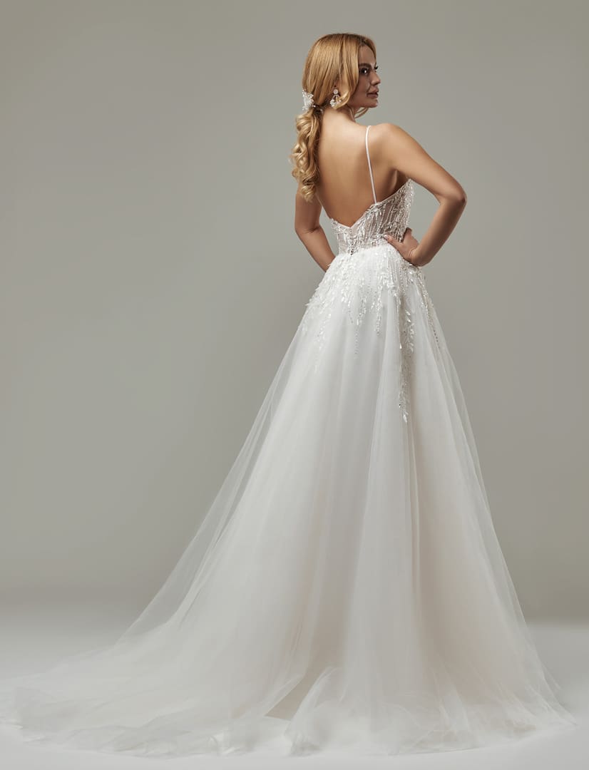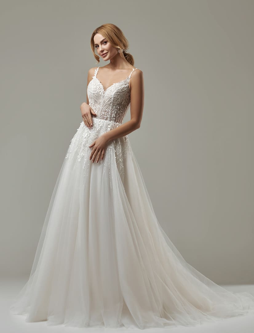 Romantisches Brautkleid in der A-Linie gehalten mit einer wunderschönen Spitze und einer Vielzahl an Glitzersteinen. Das Oberteil ist mit spitzenverzierten Spaghettiträgern und einem V-Ausschnitt ausgestattet. Der Rücken ist offen und mit Kristallknöpfen verziert. Die lange Schleppe gibt ein majestätisches Aussehen.