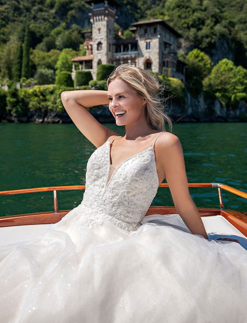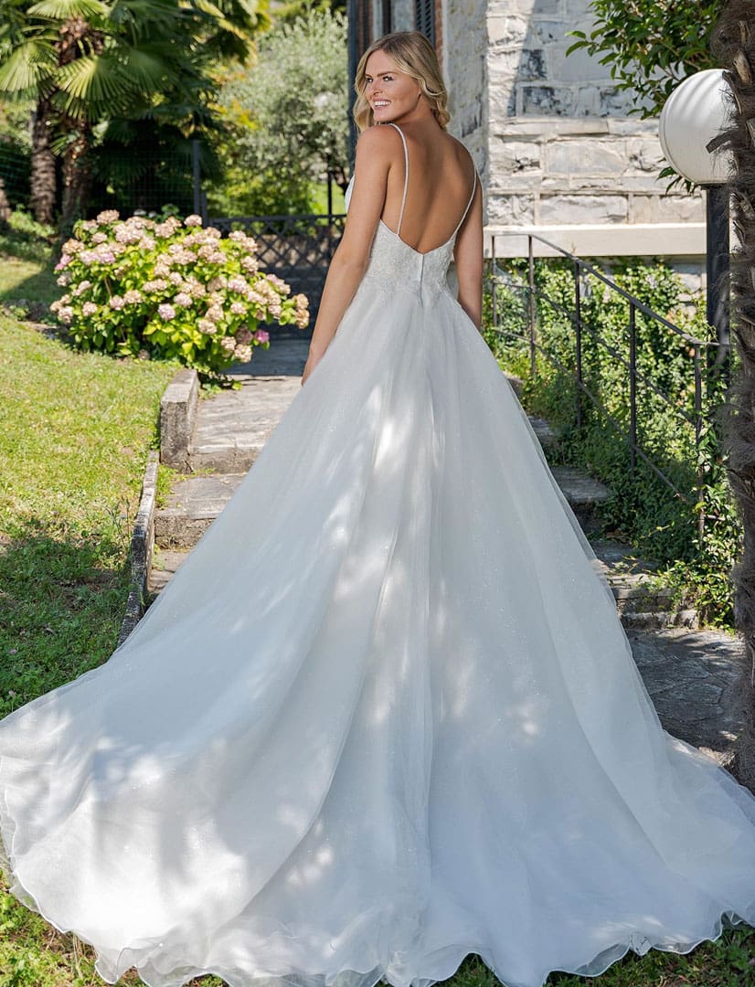 Romantisches A-Linie Brautkleid in ivory. Das Kleid ist mit einer eleganten Spitze, vielen verschiedenen Perlen und schimmernden Pailletten in unterschiedlichen Grössen verziert. Die Spitze läuft über die Taille unregelmässig aus. Der Rücken ist tief geschnitten. Der Tüllrock ist mit einem Glitzertüll und einer Lage Organza ausgestattet.