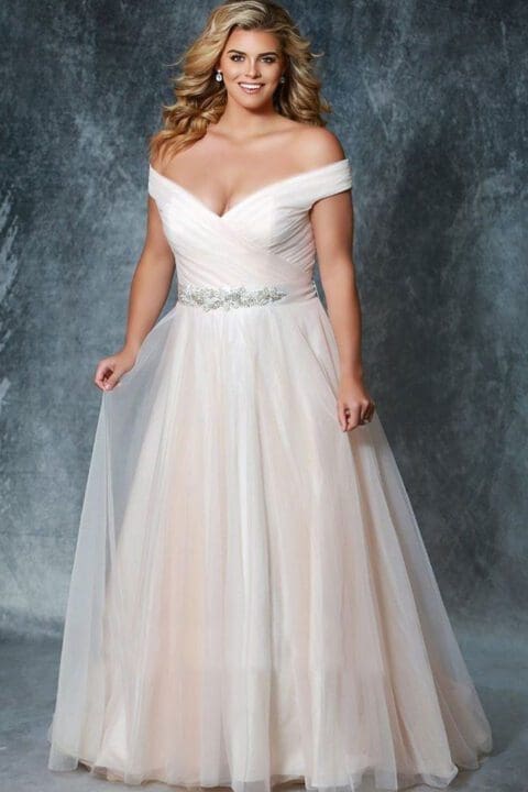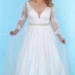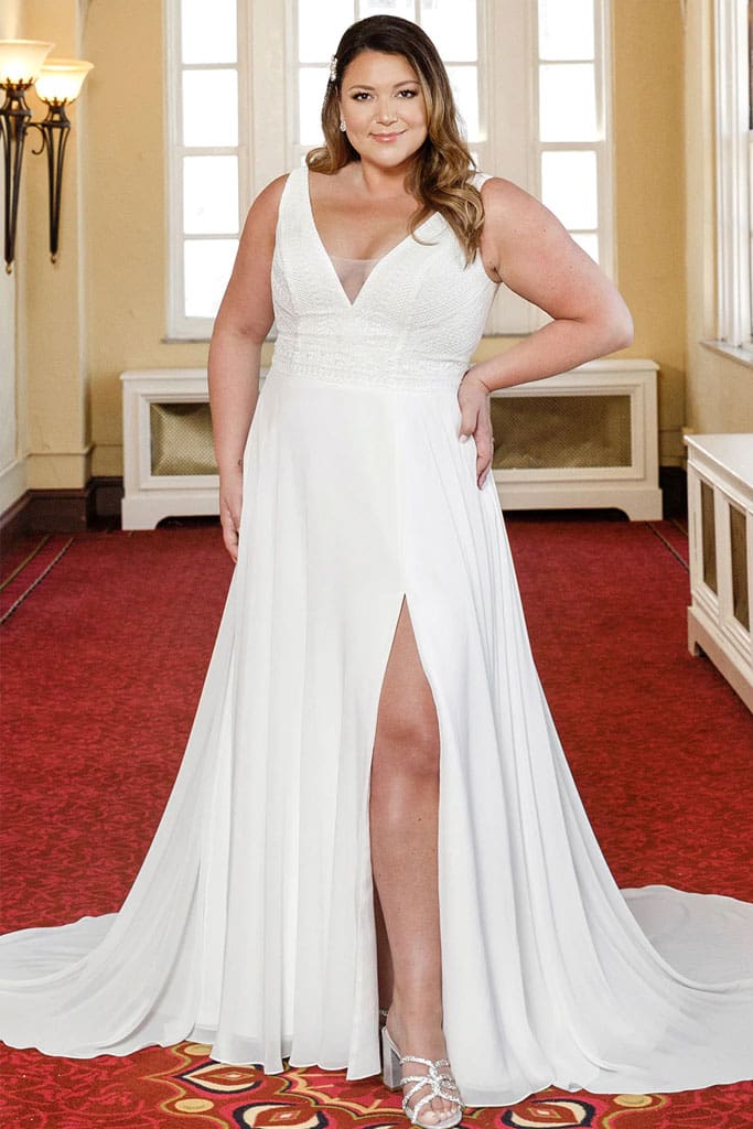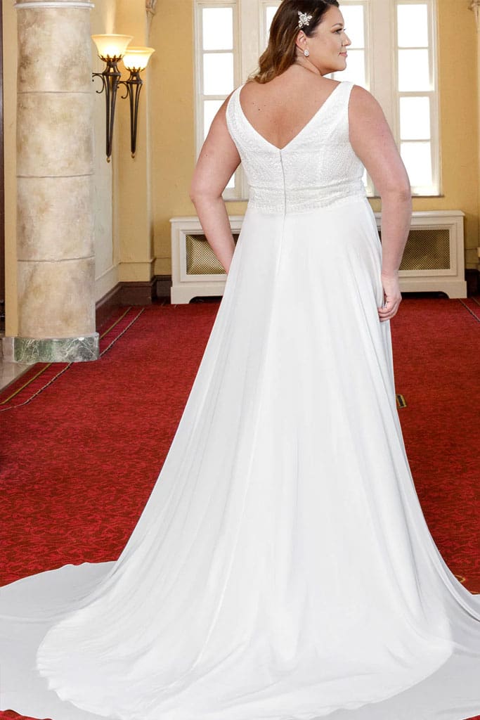 Die Vintage-Spitze verleiht diesem Brautkleid mit V-Ausschnitt ein romantisches Aussehen. Der fliessende Chiffonrock in A-Linie hat einen raffinierten Beinschlitz. Die Kapellenschleppe rundet diesen schlichten, modernen Look ab.