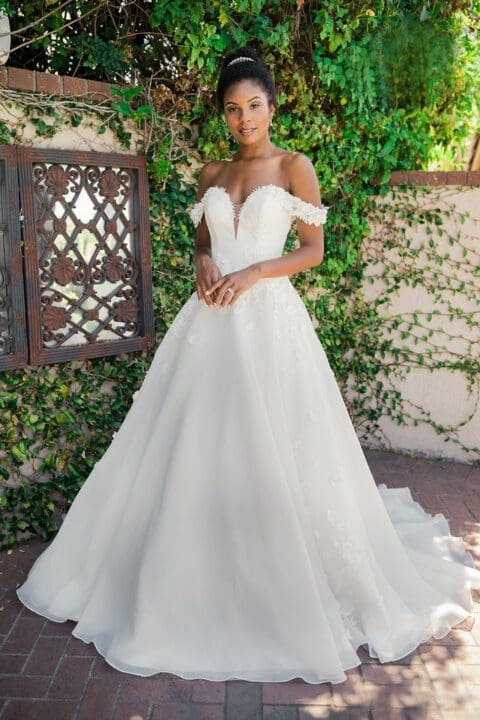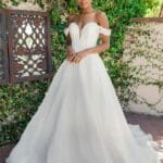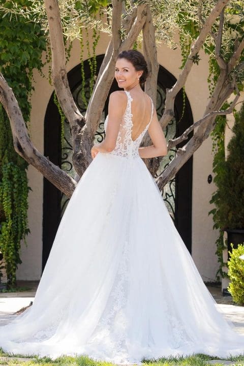 Das Brautkleid Teagan hat ein verträumtes Design und besteht aus weichem Tüll mit einer schimmernden Tülllage, die für einen dezenten Glanz sorgt. Der V-Ausschnitt und die zierlichen Schulterträger sind mit Spitze und Perlen verziert. Der Rock geht anmutig in eine bauschige Tüllwolke über und ist mit einer Netzrüsche versehen, die diesem Design einen Hauch von Romantik verleiht. Mit diesem Kleid fühlt sich jede Braut an ihrem besonderen Tag wie eine echte Prinzessin.