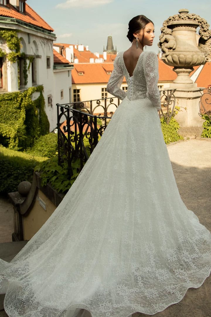 Romantisches Vintage Brautkleid aus einer feinen Spitzenapplikation gefertigt. Das Oberteil hat einen tiefen V-Ausschnitt und ist mit satinierten Knöpfen verziert. Die Spitzenärmel sind ein besonderer Hingucker. Die lange Schleppe zaubert einen romantischen Look.