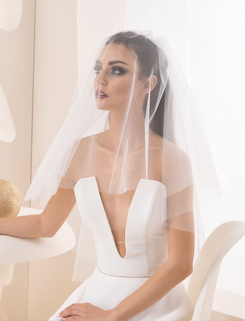 Der zweilagige Brautschleier ist mit einer Schnittkante ausgestattet und hat eine Länge von 60/80cm. Der Schleier glänzt dank dem auffallenden Glitzertüll. Der Schleier ist mit einem Kamm ausgestattet, so dass dieser einfach in die Haare gesteckt werden kann.
