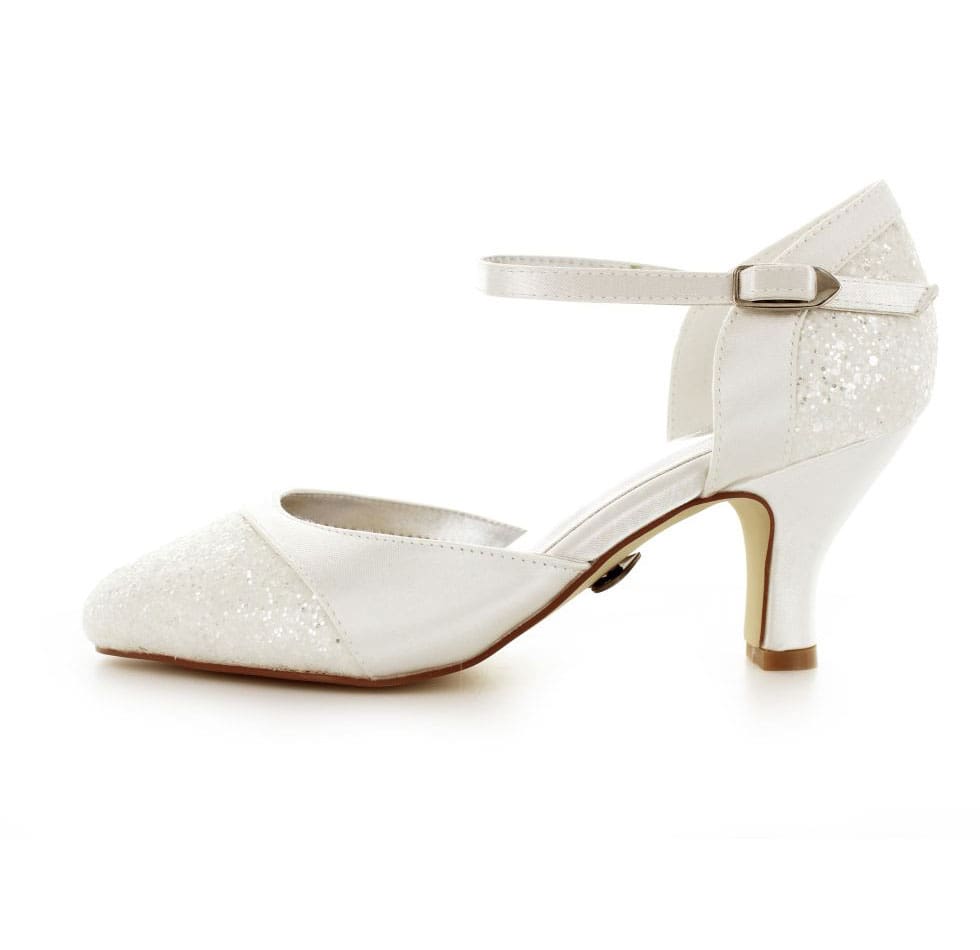 Wunderschöne Brautschuhe aus Satin mit Glitzereinsätzen. Die Pumps sehen bezaubernd aus und sind bequem zu tragen. Die Fussbettpolsterung sowie der breite Absatz sorgen für einen hohen Tragekomfort. Die Absatzhöhe bei diesem Brautschuh beträgt 6,5cm. Das Riemchen verleiht guten Halt.