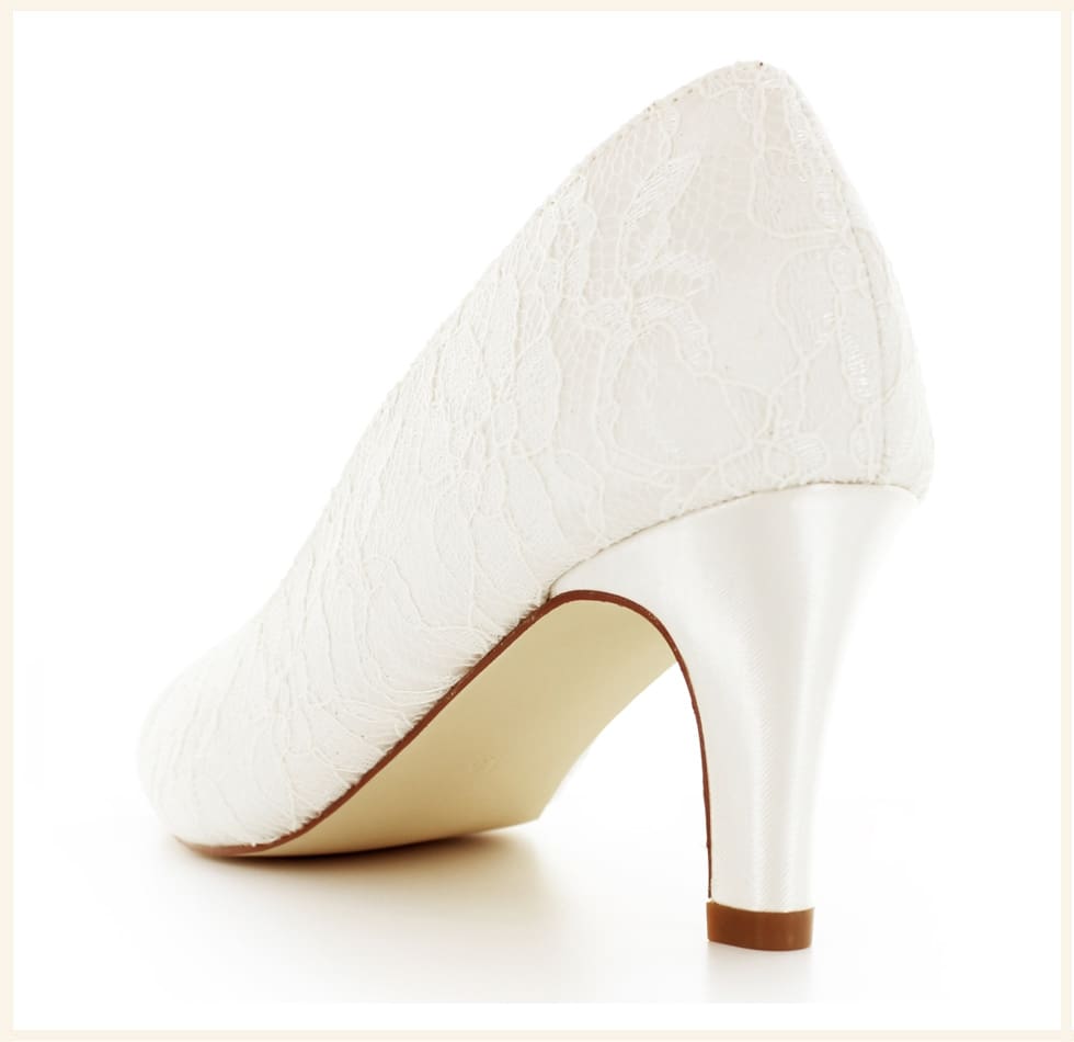 Der White Lady 883 ivory besteht aus einfärbbarem Satin, das mit Spitze umhüllt ist. Der 6.5cm hohe Trichterabsatz gibt der Braut einen guten Halt beim Laufen, während das Innere mit Softschwammfutter ausgepolstert ist. Diese klassischen Pumps sind zeitlos und wirken mit dem Spitzenbesatz sehr elegant. Es ist möglich diese Schuhe einzufärben.