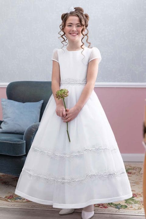 Das Kommunionkleid Cameron ist aus der Linie Pure White von Emmerling. Der seidenweiche Volantrock mit den Raffungen lässt jedes Mädchen wie eine Prinzessin aussehen. Das Kleid wird mit einem perlenbestickten Gürtel unterteilt. Ein bezauberndes Kleid für einen ganz speziellen Tag.