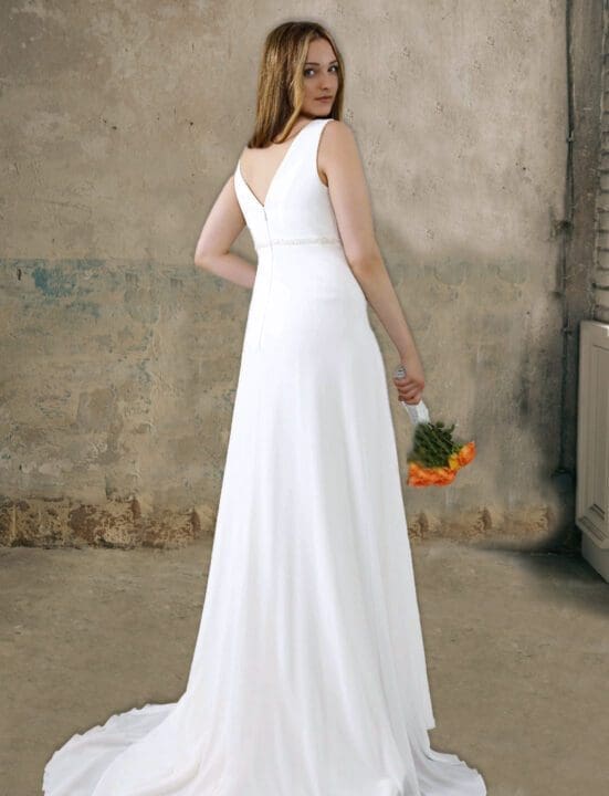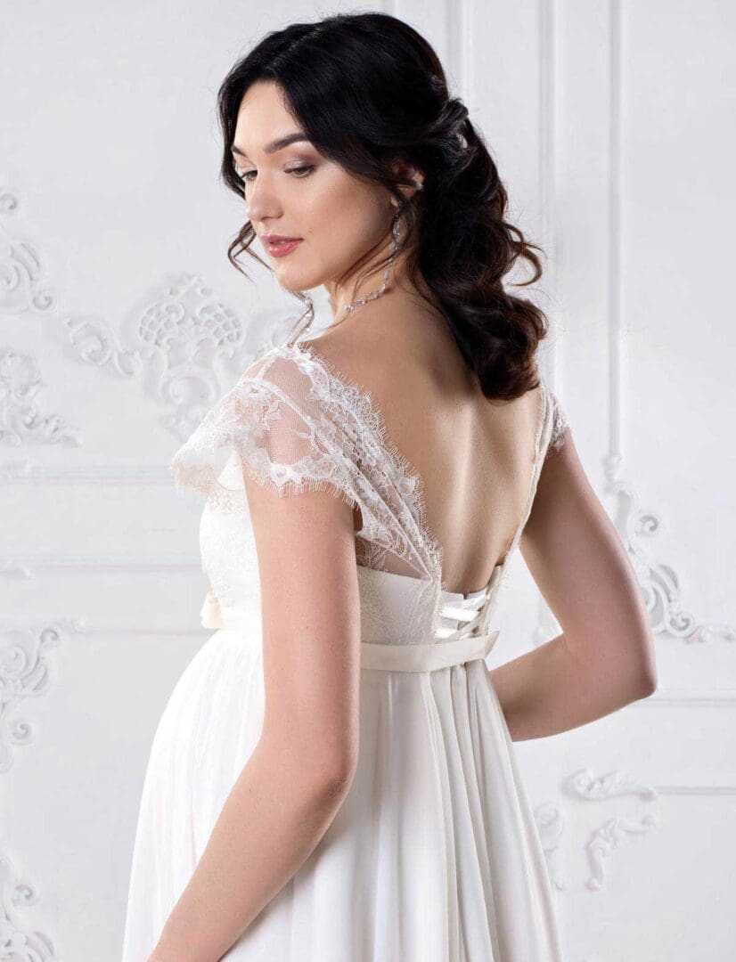 Das Umstandsbrautkleid Dayna besticht mit einer wunderschönen Spitzenapplikation, die leicht über die Schulter getragen wird. Der Rücken ist mit einer Schnürung versehen. Der leichte Chiffonrock zaubert einen romantischen Look.