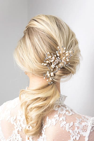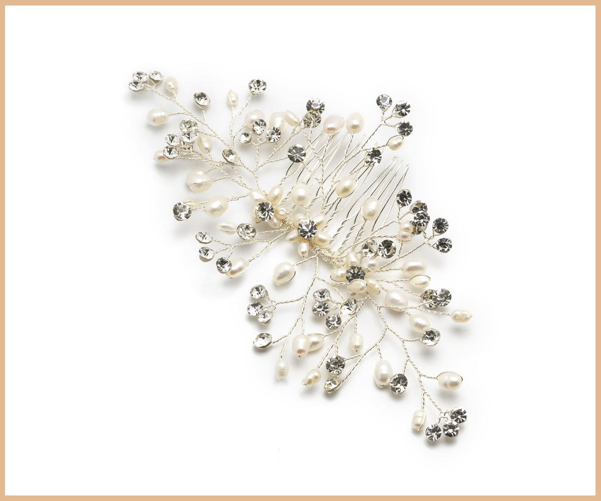 Der Haarkamm ist ein handgefertigtes Stück aus der Abrazi Bridal Kollektion. Der Kamm ist mit Süsswasserperlen und Kristallen verziert und kann mit vielen verschiedenen Frisuren wie Hochsteckfrisuren und Zöpfen getragen werden