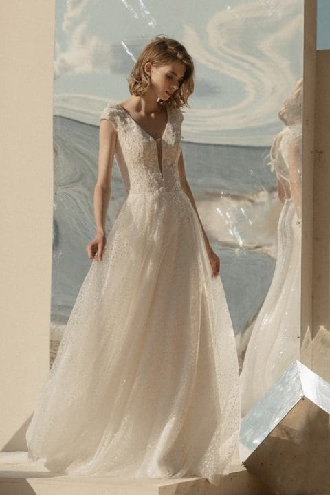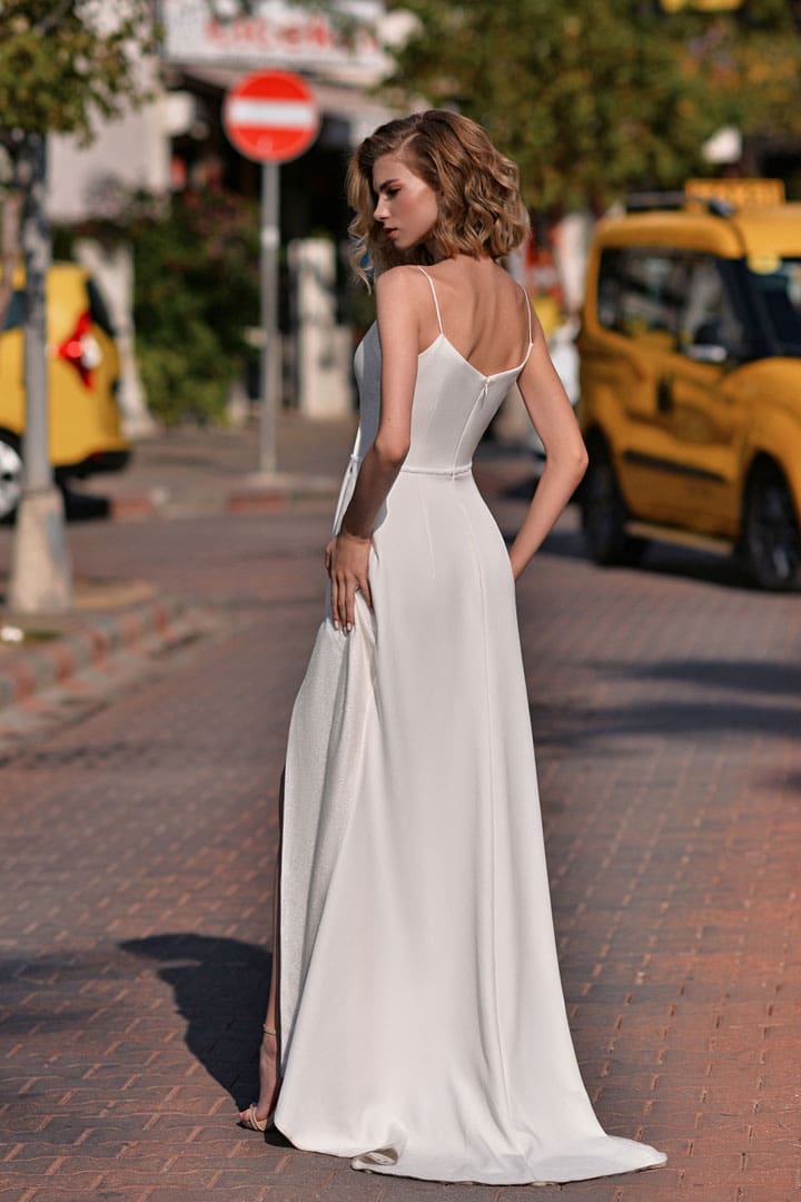 Schlichtes Brautkleid mit dem besonderen Etwas. Das Kleid glänzt mit einem schlichten Satinrock und einem auffallenden Glitzer Rock. Die feinen Spaghettiträger und der Beinschlitz vollenden den extravaganten Look.