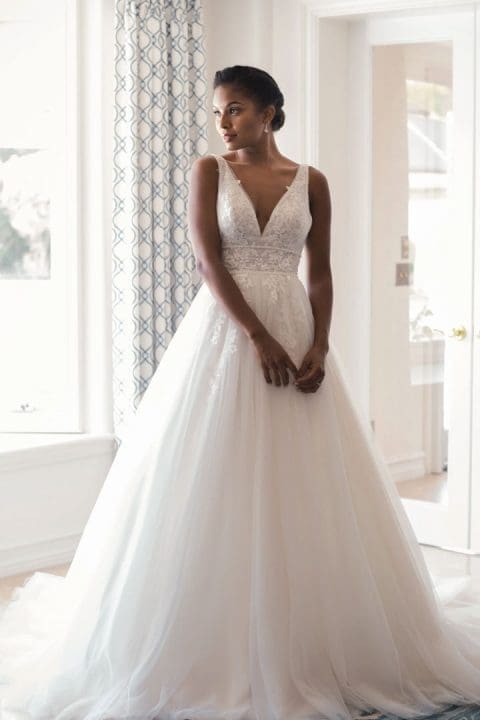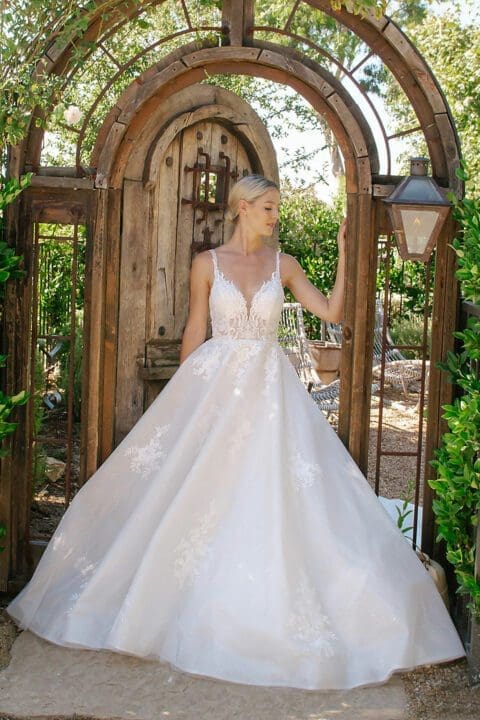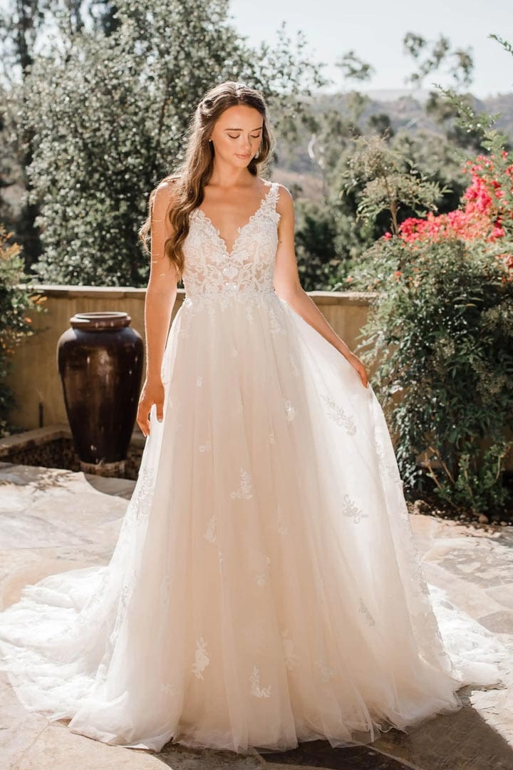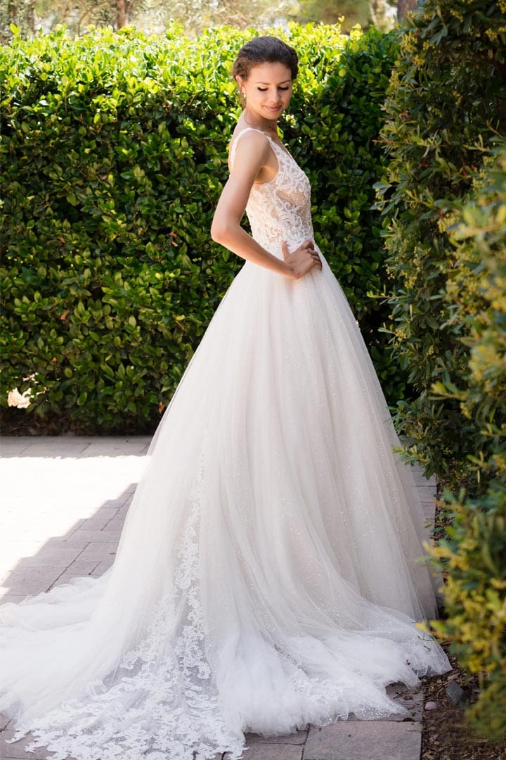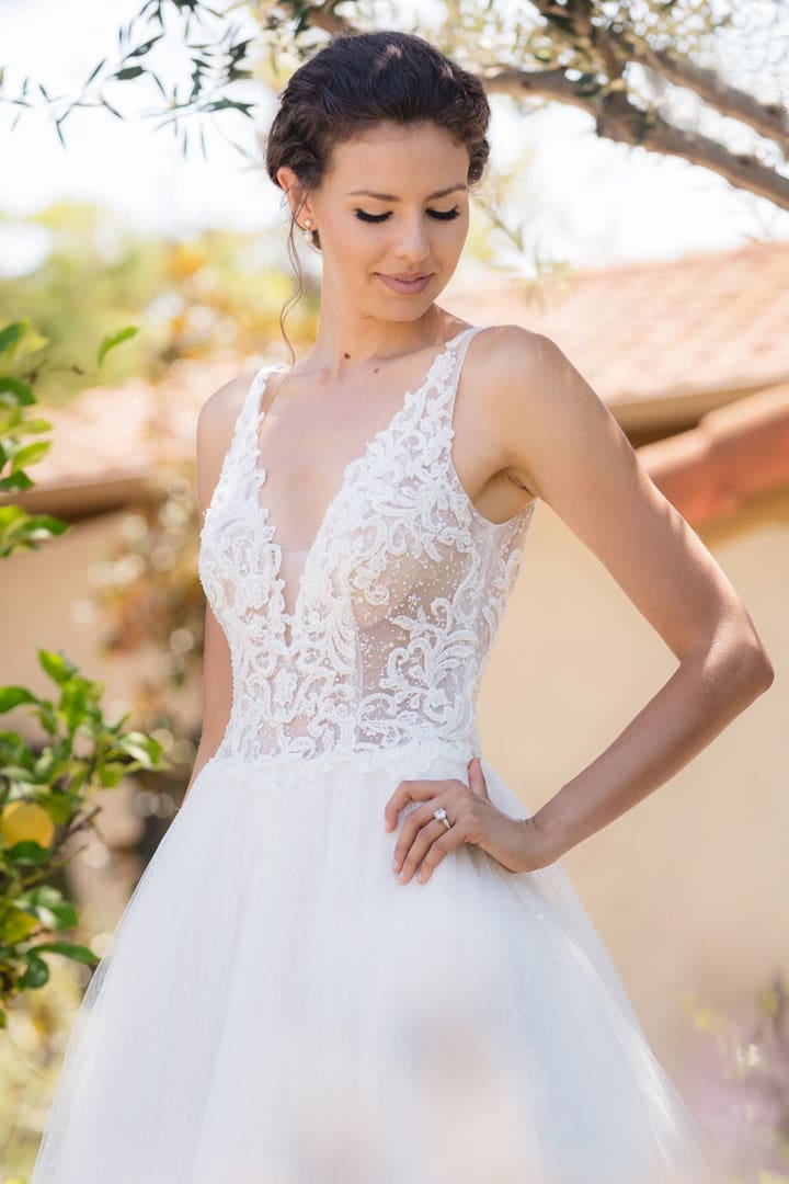 Romantisches Brautkleid aus Tüll mit Spitzenträgern und einem tiefen V-Ausschnitt. Die handbestickte Spitzenapplikation ist mit Perlen verziert und mit einem funkelnden Tüll unterlegt. Die Schleppe mit dem raffinierten Spitzeneinsatz lässt alle Blicke auf sich werfen.