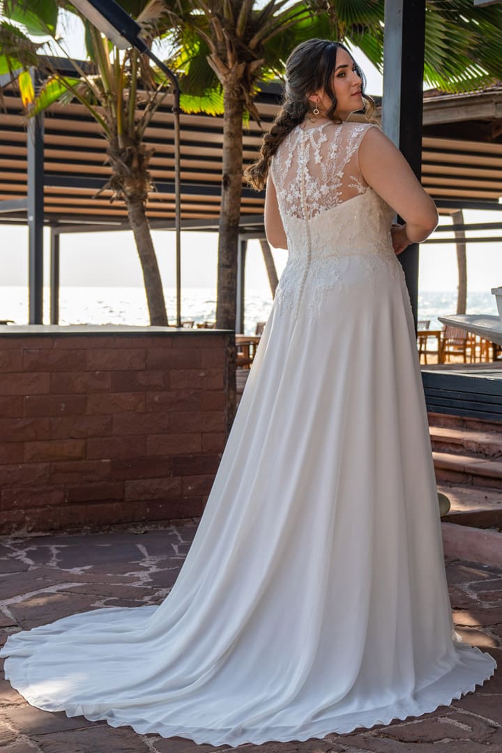 Schlichtes Brautkleid für grosse Grössen mit einem leicht fliessenden Chiffonrock. Das Brautkleid hat breite Spitzenträger und einen Rücken aus Tattoospitze. Der tiefe V-Ausschnitt rundet das schöne Design ab. Die optimale Passform bei diesem Plus Size Brautkleid schmeichelt jeder Figur.