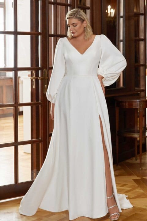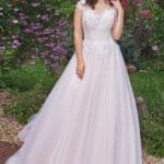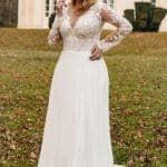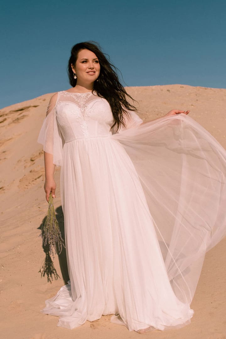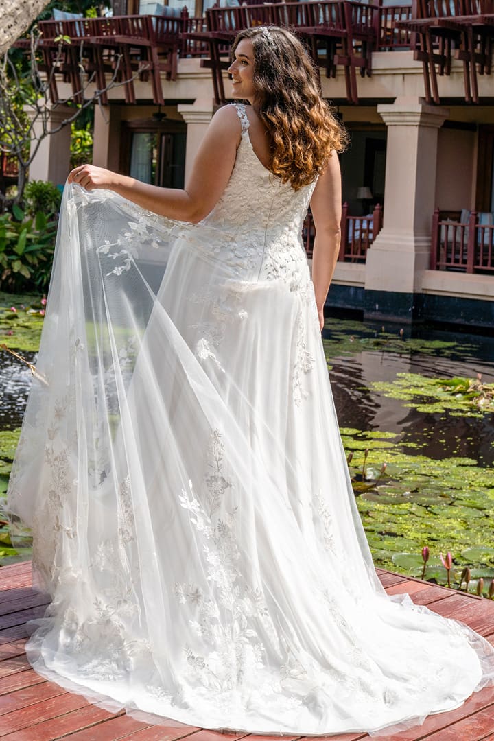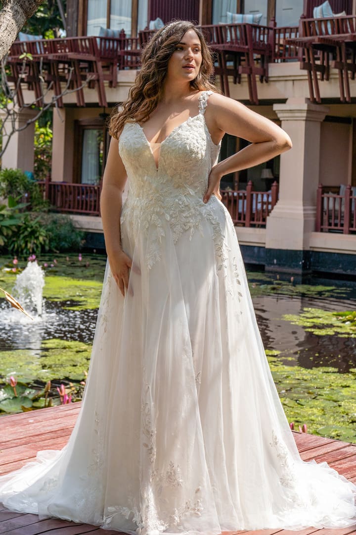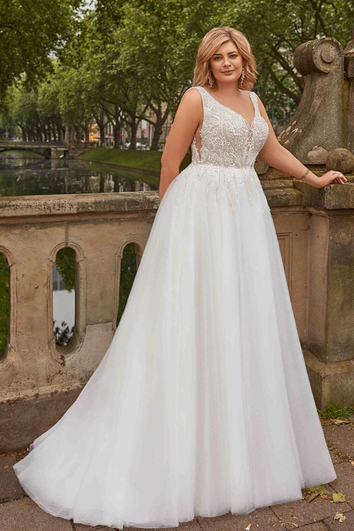Romantisches Brautkleid für grosse Grössen mit einem spitzenverzierten Tüllrock. Das Brautkleid hat schmale Träger aus Spitze und ein tiefer V-Ausschnitt. Diese A-Linie lässt jede Braut mit Kurven zauberhaft aussehen. Die optimale Passform schmeichelt jeder Figur.
