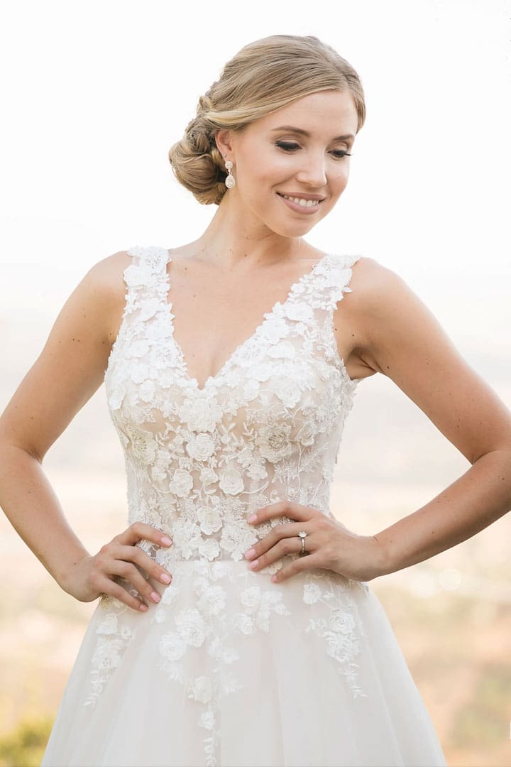 Wunderschönes Hochzeitskleid mit einem V-Ausschnitt vorne und hinten. Das Brautkleid ist mit einer dreidimensionalen floralen Spitzenapplikation verziert. Die verspielten Träger schmücken das perlenbesetzte Oberteil. Die Tüll-Schleppe in Kapellenlänge ist mit perlenbesetzten Blumenapplikationen verziert.