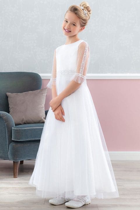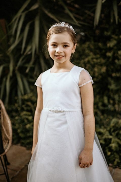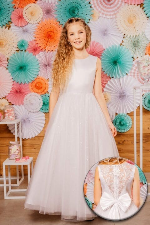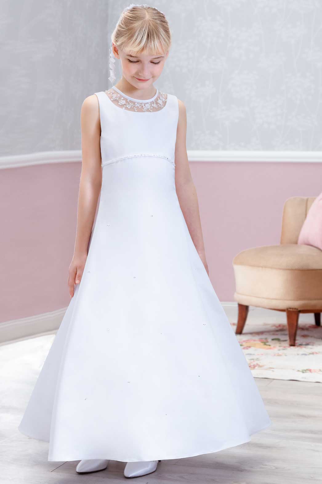 Ein wunderschönes Kommunionkleid mit einem bodenlangen Satinrock, verziert mit Strasssteinen. Das Oberteil mit dem spitzenbesetzten Rundhalsschnitt und der schmale Gürtel mit Strasssteinen lassen dich an deinem Tag besonders aussehen.