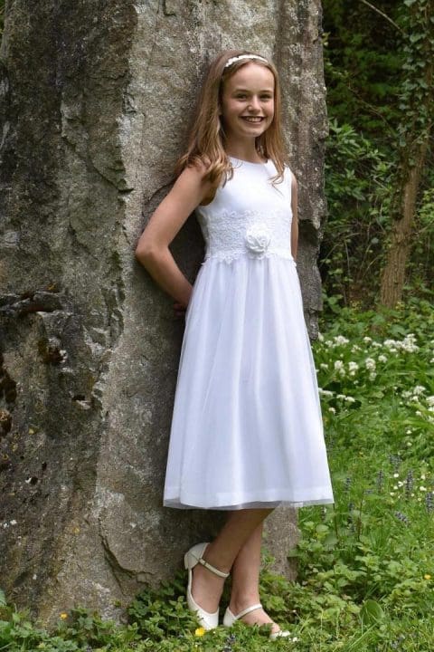 Das Kommunionkleid Elodie ist aus der Couture Linie von Emmerling. Ein hochwertig verarbeitetes Kleid aus Satin und Organza. Wunderschöne Spitzenapplikationen verzieren das Kleid an der Taille und im Rockteil.