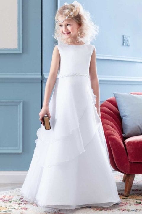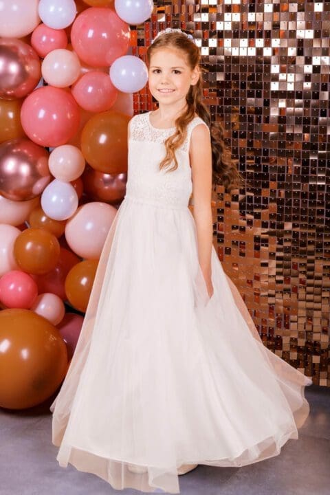 Wunderschönes Kommunionkleid mit einem weiten Tüllrock aus der Couture Linie von Emmerling. Das Kleid ist mit einer zauberhaften Spitze bestickt. Die Glitzerapplikationen bei der Taille und die satinierten Knöpfe sind ein weiteres Highlight. Kombiniere das wunderschöne Tüllkleid mit den passenden Accessoires von Emmerling.