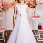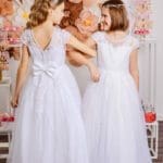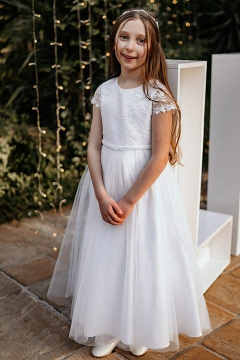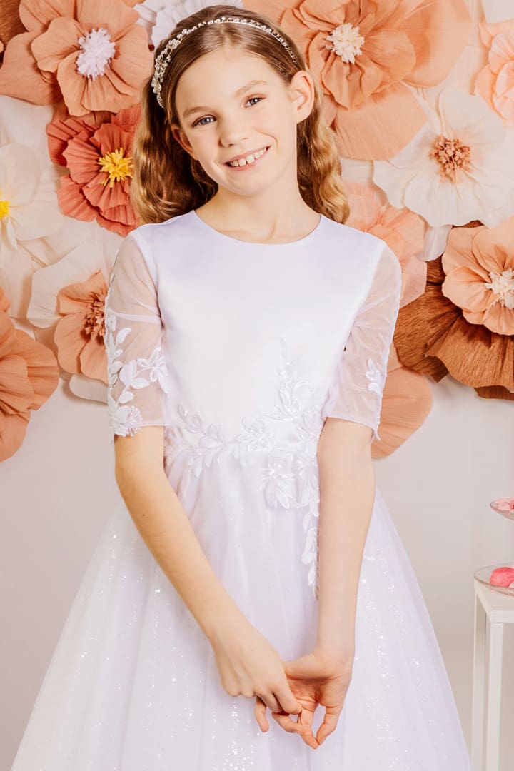 Prinzessinnen Kommunionkleid hochwertig verarbeitet mit einem weiten Glitzer Tüllrock. Die langen Spitzenärmel zaubern ein romantisches Aussehen. Das Oberteil aus Satin ist mit einer schönen Spitzenapplikation mit Glitzersteinen verziert, die in den Tüllrock appliziert ist. Der Rücken ist mit Satinknöpfen verziert.