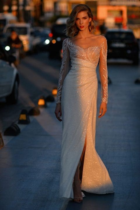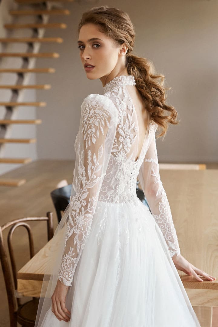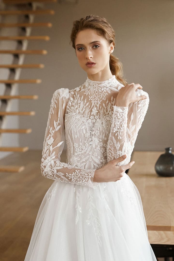 Atemberaubendes Langarm Brautkleid mit einer hochwertig verzierten Spitzenapplikation. Das Brautkleid mit dem extravaganten Oberteil sorgt für einen Hauch von Glamour. Dieses aussergewöhnliche Brautkleid mit dem weiten Tüllrock ist ein Traum für alle Bräute, die gerne Glitzer mögen.