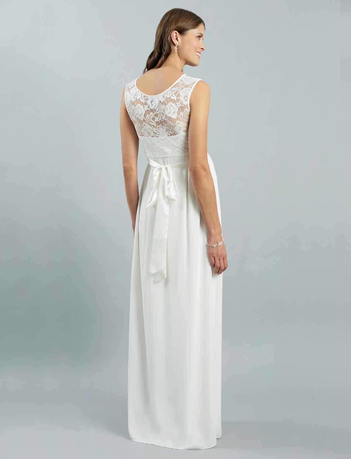 Das Umstandsbrautkleid Lucy mit einem fliessenden Chiffonrock und dem raffinierten Schnitt passt sich der Figur in der Schwangerschaft perfekt an und umspielt den Babybauch geschickt.