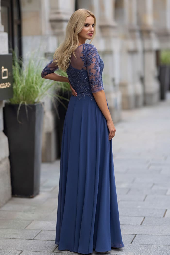 Elegantes Abendkleid in der Farbe Vintage Indigo. Der weite Chiffonrock schmeichelt jeder Figur. Das Spitzenoberteil mit V-Ausschnitt und die 3/4 Ärmel aus Spitze zaubern einen romantischen Look. Mit diesem Kleid ist ein unvergesslicher Auftritt garantiert.