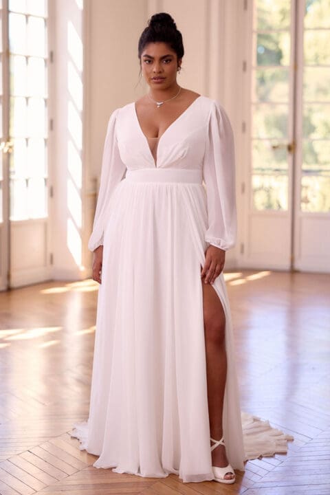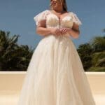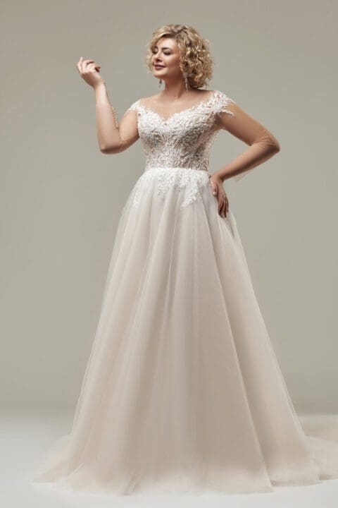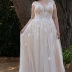 Klassisches Brautkleid mit einer floralen Spitzenapplikation und Ziersteinen verziert. Das Oberteil hat breite Spitzenträger und einen V-Ausschnitt. Als Verschlussart wurde bei diesem Modell eine Schnürung ausgewählt. Die Schleppe macht den krönenden Abschluss.