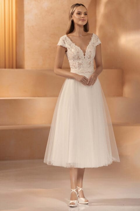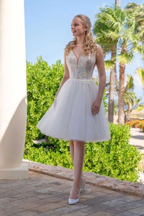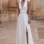 Modernes Wickel-Braut-Top aus ausgewähltem Stretch-Crêpe gefertigt, das Oberteil hat einen V-Ausschnitt. Kombinierbar ist das Oberteil mit einer weiten Brauthose oder mit einem Rock. Ein toller Brautlook für eine Standesamthochzeit.
