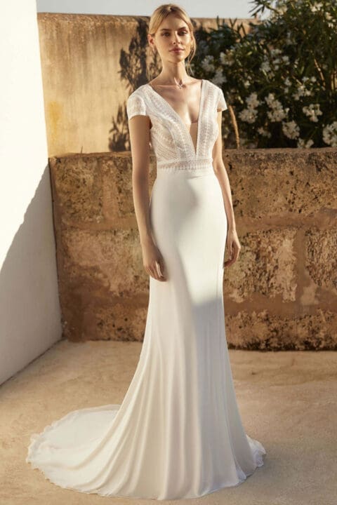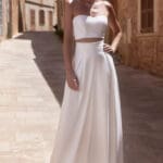 Kurzer Brautrock aus hochwertigem Tüll gefertigt, kombiniert mit einem romantischen Spitzentop verziert mit unzähligen Pailletten und Glitzersteinchen. Wahlweise auch mit einem Rock aus Satin oder Chiffon kombinierbar in kurz oder lang.