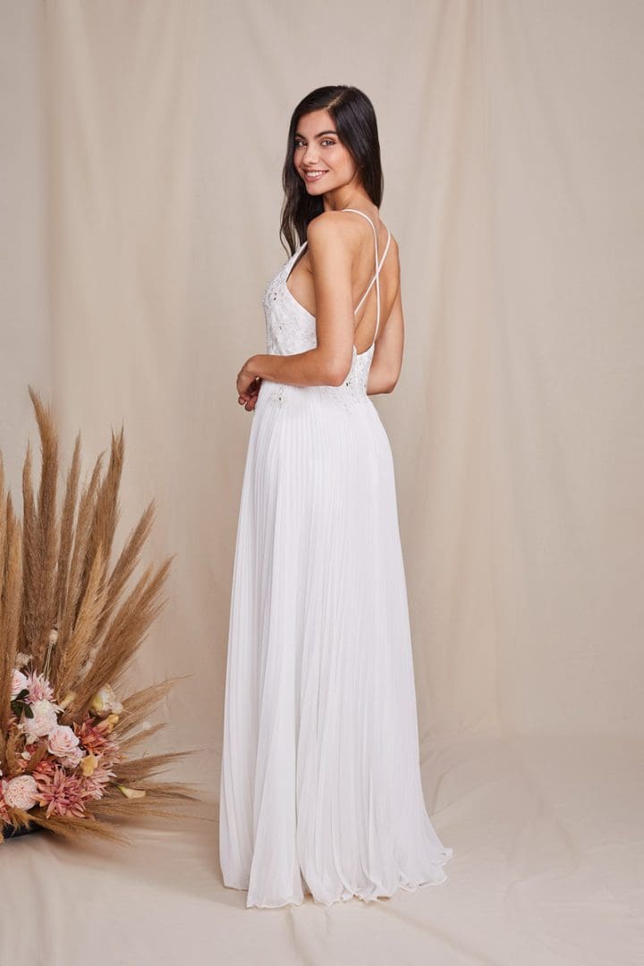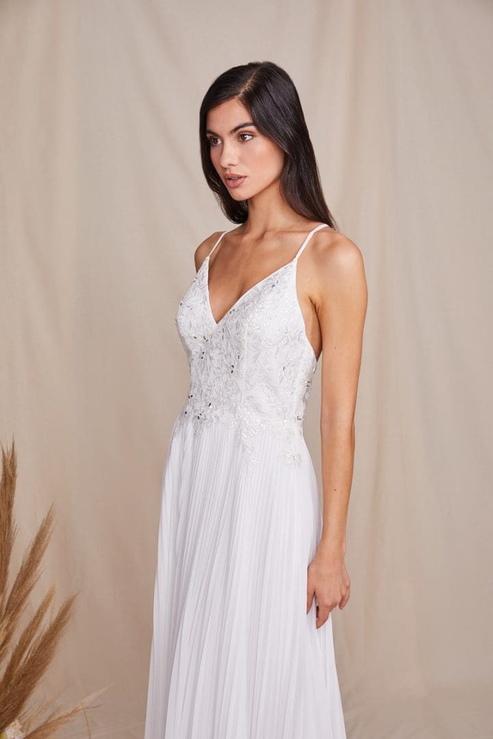 Wunderschönes Standesamtkleid mit einem langen Plissée Chiffonrock. Das Oberteil mit den gekreuzten Trägern hat einen V-Ausschnitt und ist mit einer Spitze und Ziersteinen verziert.