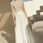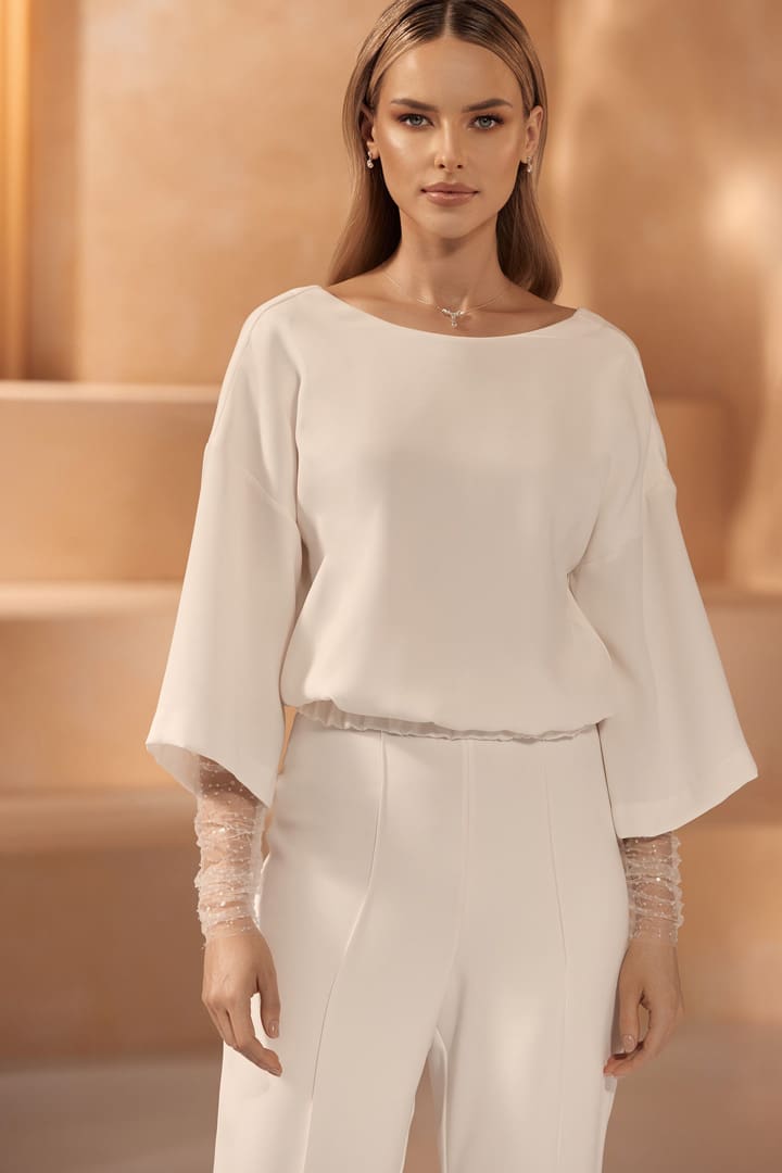 Das Stretch-Crêpe-Braut-Top mit 3/4-Ärmeln und U-Boot-Ausschnitt ist ein perfektes Accessoire für Bräute, die einen klassischen Touch in einem modernen Outfit suchen. Kombiniere den Sweater mit einer modernen Brauthose, gefertigt aus hochwertigem Stretch-Crêpe.