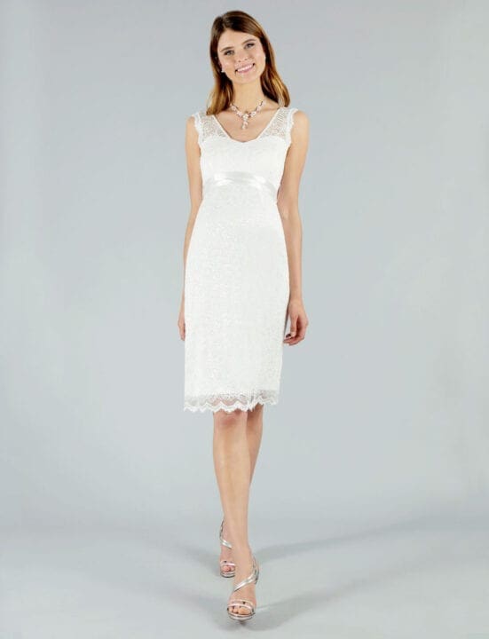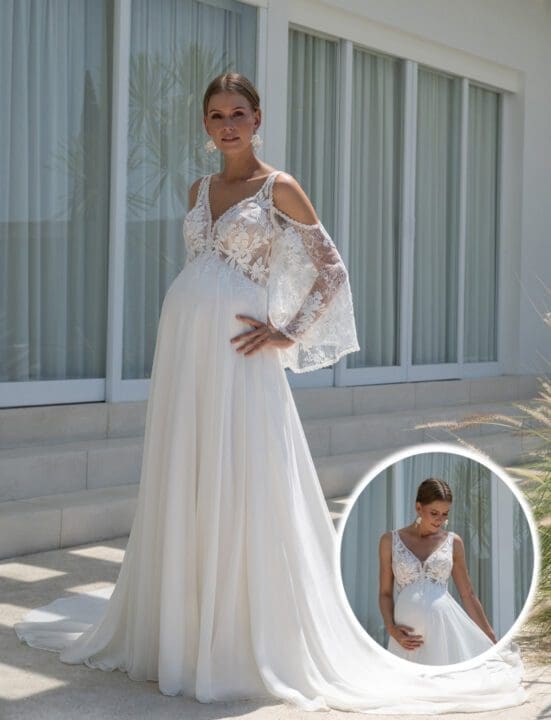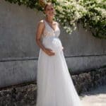 Romantisches Umstandsbrautkleid mit einem zauberhaften Tüllrock und einer Schleppe. Das detailverliebte Spitzenoberteil ist transparent und hat einen tiefen V-Aussschnitt mit vielen Glitzerelementen. Das Umstansbrautkleid wir am Rücken mit einer Schnürung gebunden.