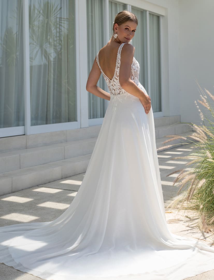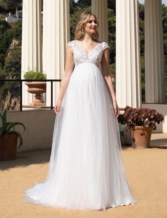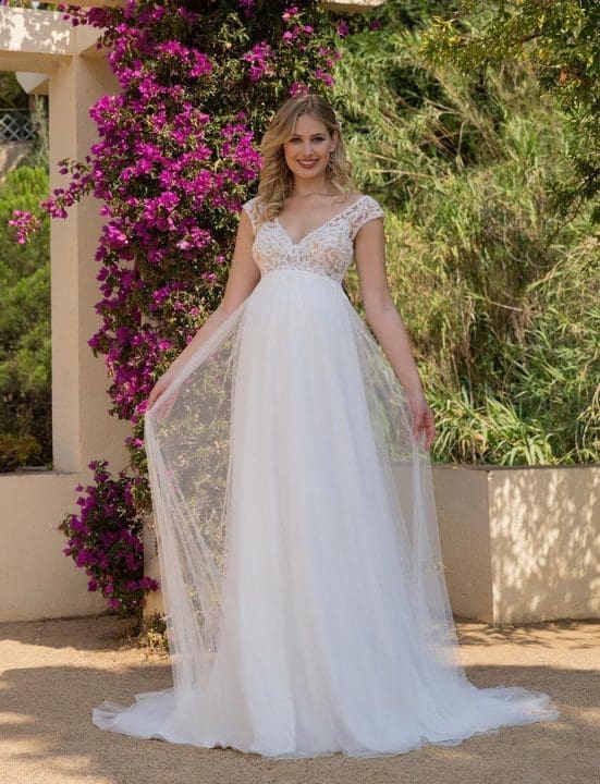 Romantisches Umstandsbrautkleid mit abnehmbaren Flatterärmeln. Der leicht fliessende Chiffonrock hat einen Schleppe. Das Oberteil ist mit Blumen bestickt. Das Off-Shoulder Umstandsbrautkleid zaubert einen Hauch von Romantik. Der Rücken hat einen tiefen V-Ausschntt.
