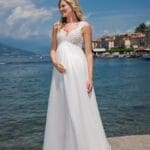Atemberaubendes Umstandsbrautkleid mit einer zauberhaften Spitzenapplikation. Der Glitzertüllrock mit Schleppe verleiht dem Umstandsbrautkleid einen Hauch von Glamour. Die Schnürung am Rücken ist praktisch und lässt sich nach Belieben anpassen.