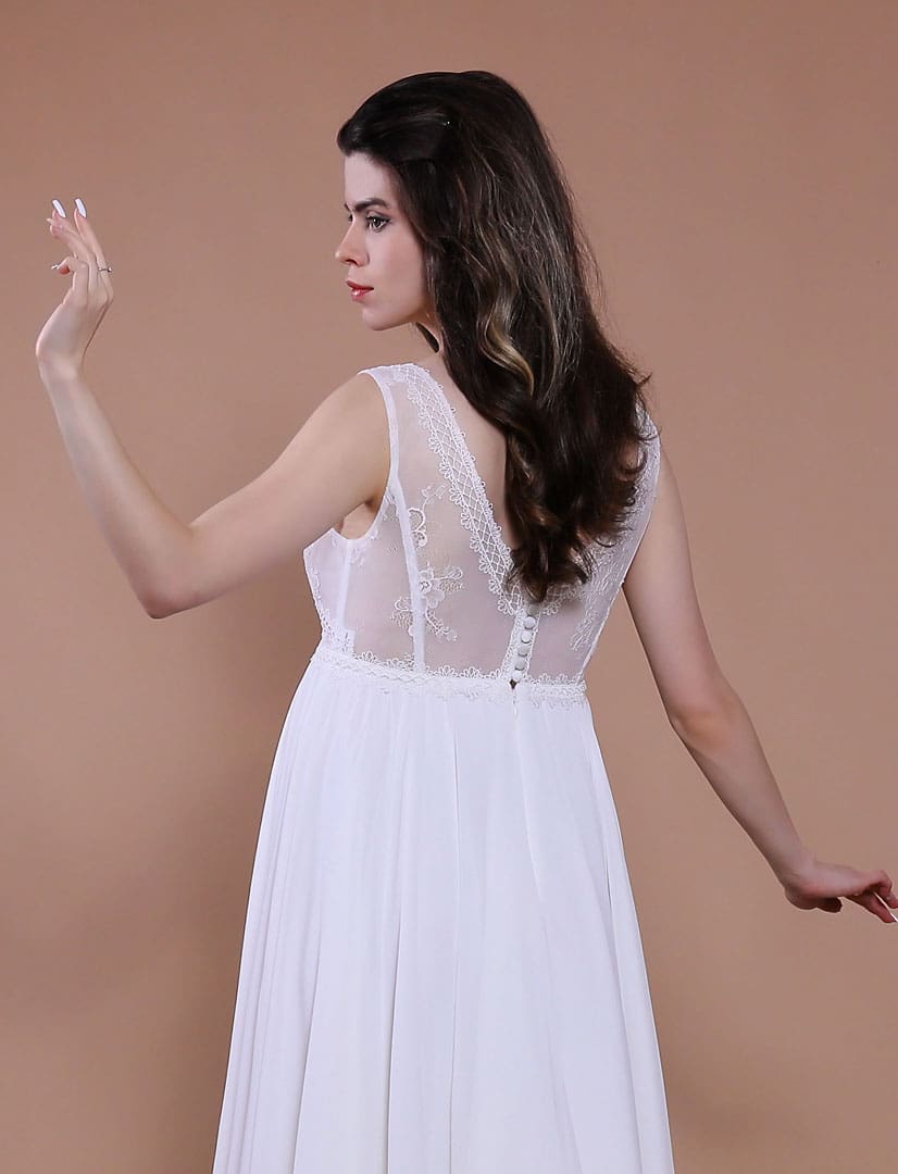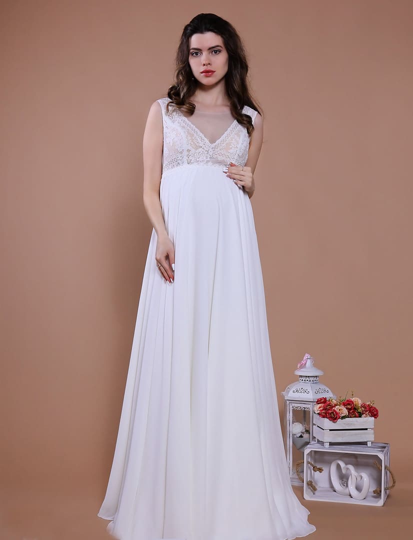 Zauberhaftes Umstandsbrautkleid mit einem leicht fliessenden Chiffonrock. Die Spitzenoberteil im Vintage Look ist mit satinierten Knöpfen am Rücken verziert. Der leicht fallende Chiffonrock schmeichelt jeder Figur und lässt den Babybauch wunderschön aussehen.