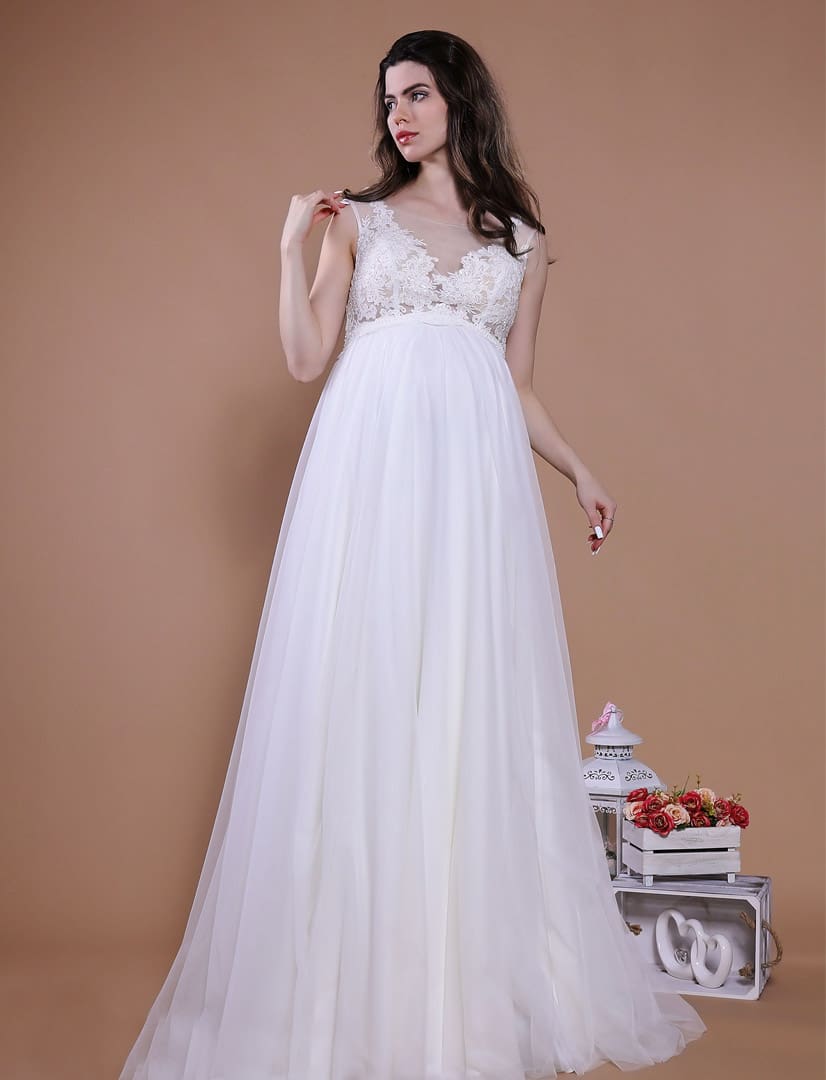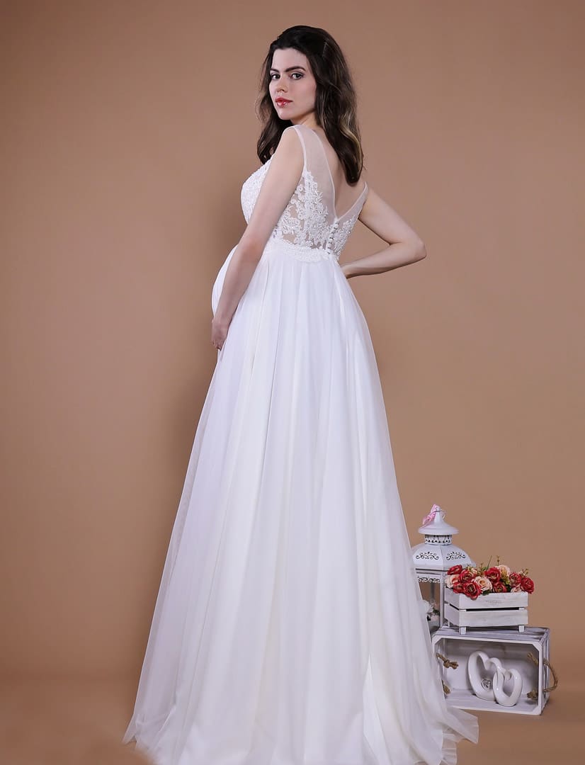 Romantisches Umstandsbrautkleid mit einem leicht fliessenden Tüllrock. Das Oberteil ist mit einer wunderschönen Spitzenapplikation und mit satinierten Knöpfen am Rücken verziert. Der leicht fallende Tüllrock lässt den Babybauch besonders schön aussehen.