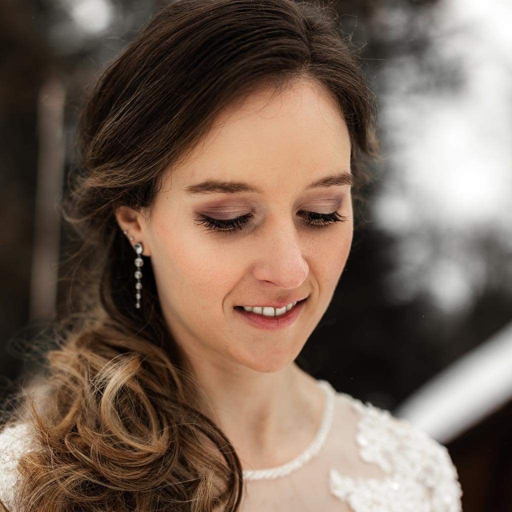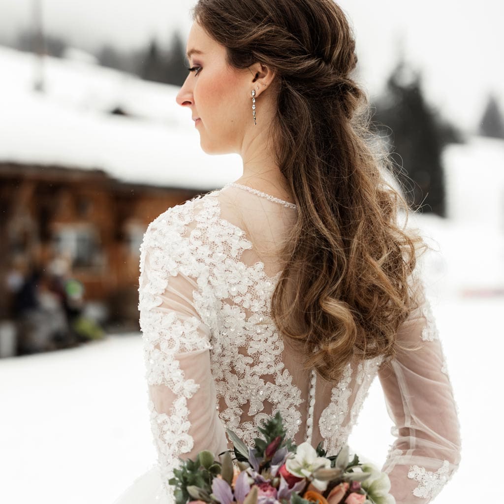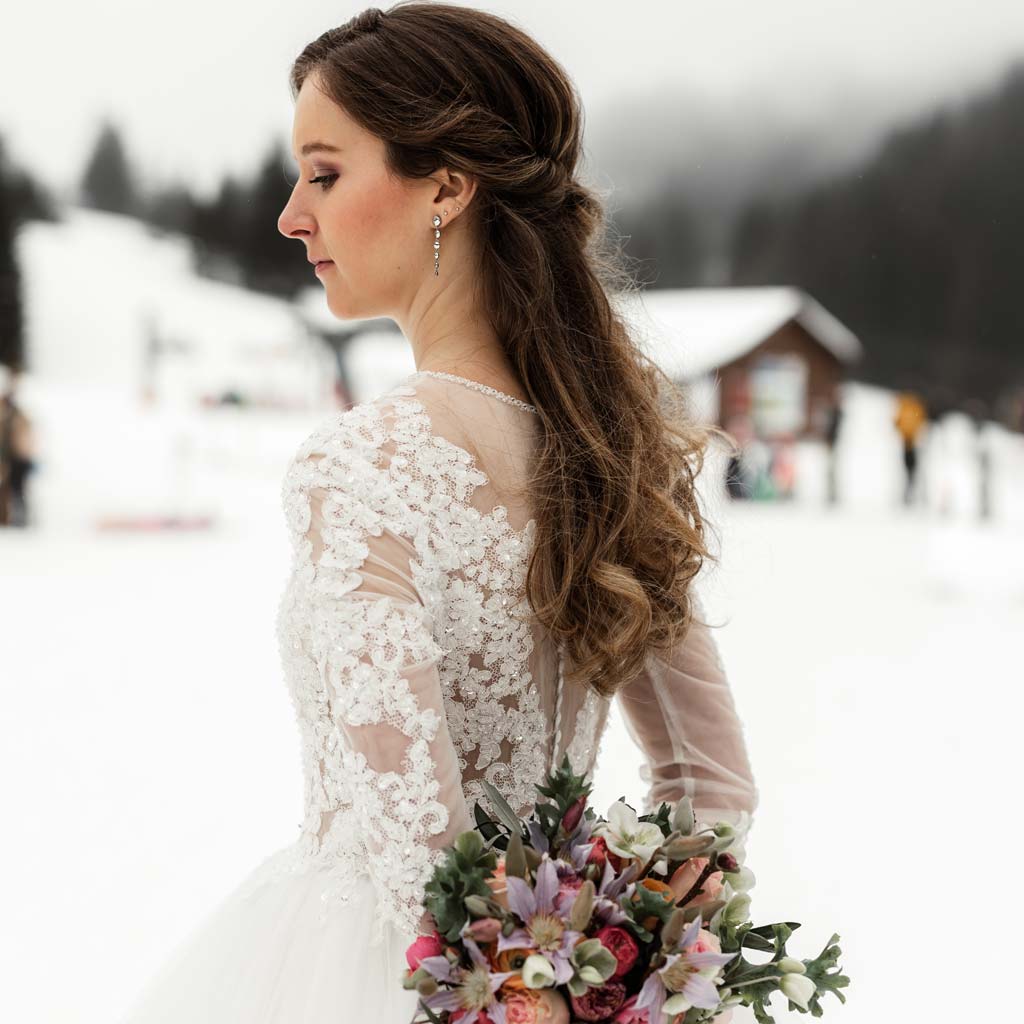 Am Tag deiner Winterhochzeit möchtest du alle Blicke auf dich ziehen. Deshalb solltest du Brautfrisur und Make-up mit Bedacht auswählen. Wende dich am besten an eine erfahrene Stylistin, die dir dabei hilft, einen typgerechten Look zu kreieren. Tipp: Metallische Lidschatten sind in der kalten Jahreszeit besonders angesagt, da sie den Glanz von Eis und Schnee imitieren. Sie passen wunderbar zu Lippenstiften in dezenten Nude- oder Rosenholztönen. Wasserfeste Volumenmascara setzt deine Augen in Szene, während Rouge einen sanften Glow auf deine Wangen zaubert. Romantische Flechtfrisuren werden auf jeder Winterhochzeit zu einem absoluten Hingucker. Locker gesteckte Dutts sowie halboffene Frisuren harmonieren ebenfalls mit einem winterlichen Hochzeitsmotto. Schmücke dein Haar mit einem Schleier oder einem glitzernden Diadem, um den Brautlook zu vervollständigen.