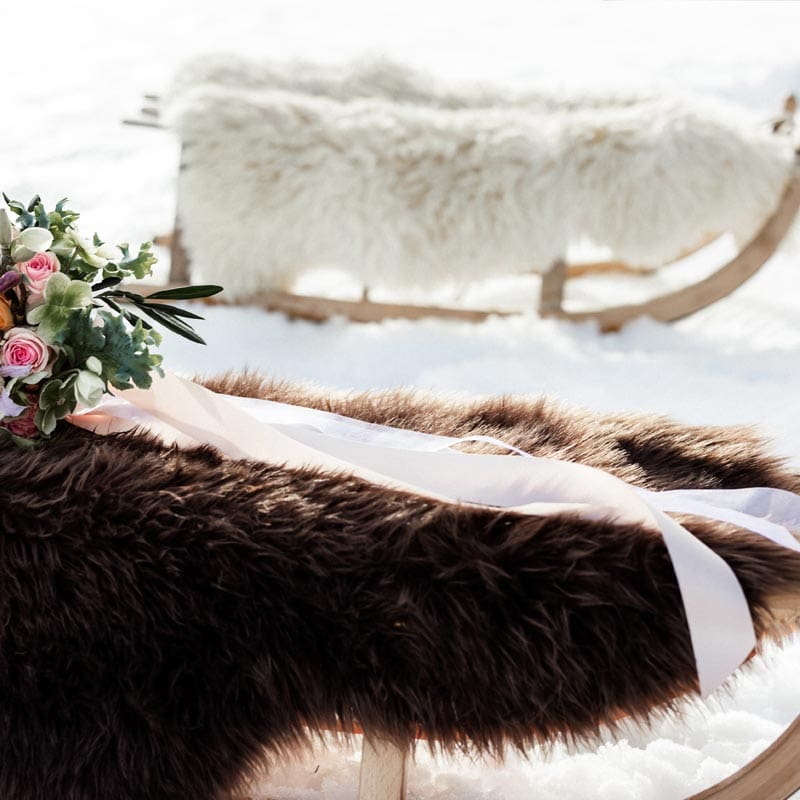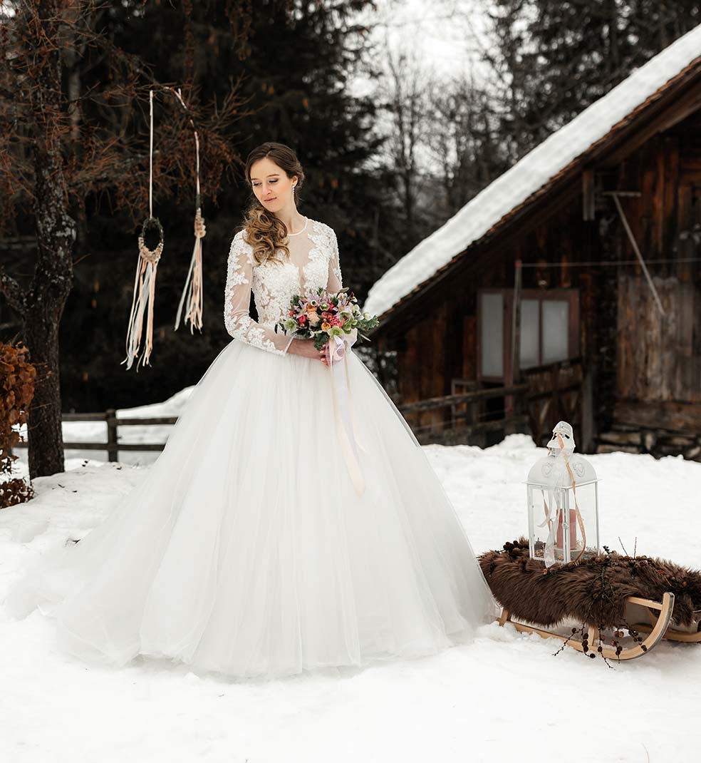 Stilvolles Hochzeitskleid und kuschelige Accessoires - die Garderobe der Winterbraut